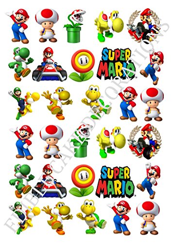 Specification: 30 x taart-, bakwarendecoratie van eetpapier met motief “Super Mario”
