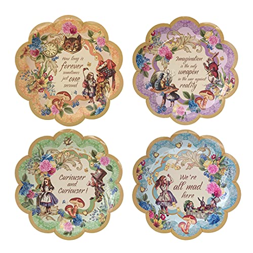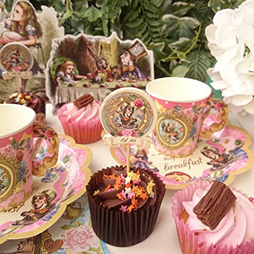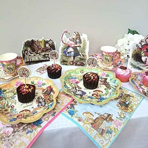 WAT IS INBEGREPEN: Onze set bevat 16 kopjes, met 16 kleine borden 7 inch breed, 16 grote borden 9 inch breed met 4 verschillende afbeeldingen en kleuren, 24 servetten van 9,8 inch in twee verschillende kleuren, 6 cocktailsticks met 6 toppers en 3 Alice thema rekwisieten om uw tafel te versieren