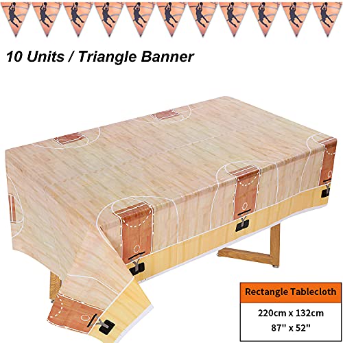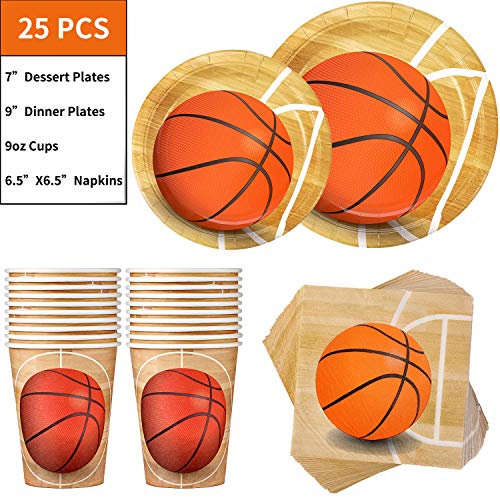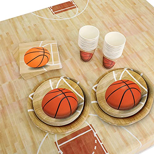 KIT VOOR 25 PERSONEN: Deze 102-delige papieren basketbal servie set bevat 25 papieren dinerborden van 9 inch, 25 papieren dessertborden van 7 inch, 25 papieren bekers van 9 oz en 25 servetten van 6,5 inch x 6,5 inch, 1 tafelkleed en 1 driehoeksbanner.