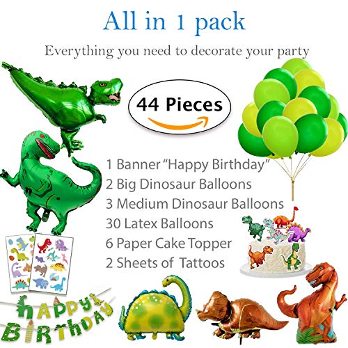 ★ LUXE SET – PREMIUM KWALITEIT ★ Deze maxi formaat decoratie set heeft alles wat u nodig heeft om uw feest onvergetelijk te maken. Er is een totaal van 44 stuks waaronder 1 vrolijke bithday banner, 2 gigantische dinosaurusfolie ballonnen, 3 mid dinosaurusfolie ballonnen, 6 taart toppers, 30 groene latex ballonnen en 2 dinosaurus tatoeages.