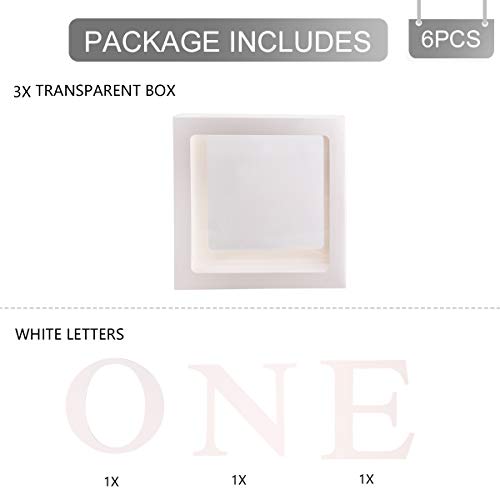 Het pakket bevat: 3 stuks 11.81″ x 11.81″ x 11.81″ unisex witte transparante dozen met 3 stuks witte letters “O” “N” “E”. Ballondoos kan worden gevuld met ballonnen van elke kleur (die u levert) evenals feeënlichten of andere verjaardagsfeestdecoratie.