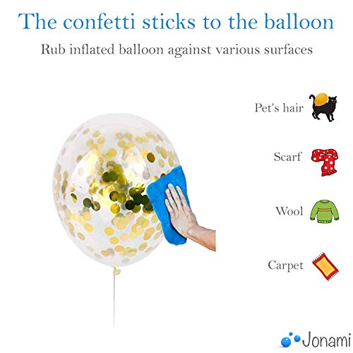 ★ TIPS ★ Blaas de ballon niet op met uw mond. Blaas de ballon op met een ballonpomp en wrijf met uw hand of een stuk stof over de ballon om statische elektriciteit te creëren. BELANGRIJK! Voordat u de ballon opblaast met helium, spuit een beetje water in de ballon en wrijf de confetti met uw handen herhaaldelijk in de ballon, zodat het vocht helpt om de stukjes goudconfetti aan de ballon te laten kleven.