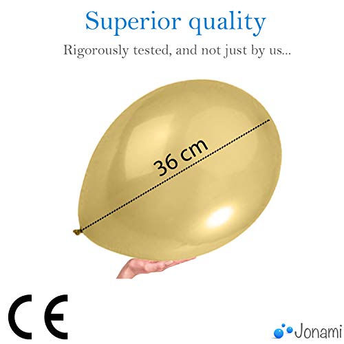 ★ HOGERE KWALITEIT ★ Jonami ballonnen zijn CE gekeurd ! Alleen gemaakt van Natuurlijke Latex, niet giftig en 100% biologisch afbreekbaar. In tegenstelling tot de meeste ballonnen beschikbaar op Amazon, zijn deze ballonnen perfect rond. Ze zijn dikker en dus resistenter!