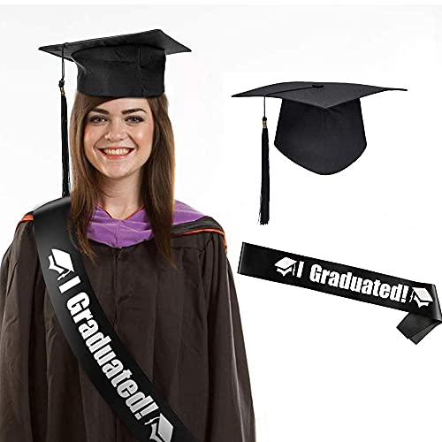 Inhoud pakket: 1 stuk zwarte graduierhoed , 1 stuk satijn afgestudeerde sjerp “I Graduate!” Tweedelig afstudeerpak, geschikt voor de meeste mensen.
